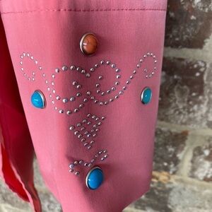 Vintage Maggie suite long sleeved blouse in a size large. Silver studded design at collar and cuffs. Color is peach skin. Buttons down front. Armpit to armpit Measures 23 inches. Shoulder to hemline 28 inches. Sleeve length 24”. 100% polyester. Machine wash cold. Slit at Hemline on both sides. Shoulder pads.Gently preowned condition. Padded shoulders.