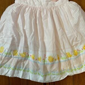 pink and white striped, chick spring design on bottom, ruffle top with pompoms, chick button back
