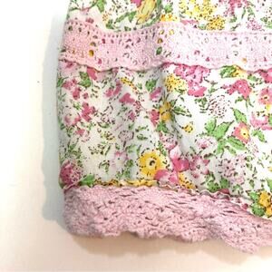 Green, yellow, and pink spring flower pattern w/ pink lace trim and details