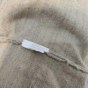 Features beautiful sparkly gold tight knit stretch sweater, folded turtleneck, form fitting top, long fitted sleeve with extra long ribbed cuff, cinched on sides at waist, falls above hips, perfect for layering.