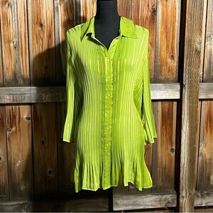 Maggie Barnes woman green blouse/top has a button front and long sleeves, pleated in a semi-sheer fabric, lightweight, the pic with the tag is the closest to the color