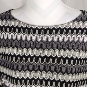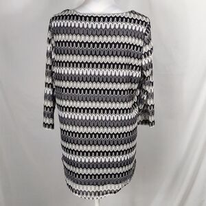 This black, white, gray and metallic silver Maggie Sweet long sleeve crocheted tunic is a size Large with a pit to pit measuring 23". It is lined with sheer sleeves. Self: 96% polyester 3% metallic 1% nylon, Lining: 100% polyester and hand washable. Pre-owned and in excellent condition. All offers welcome.