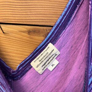 Maggie's Organics purple stress dress with deep v neck front and back. Flattering and comfortable. Vibrant purple and blue stripe pattern. Size XL.