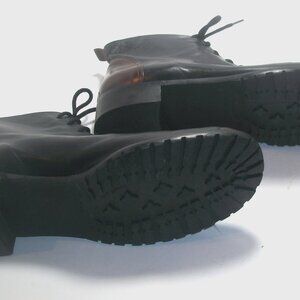 Maggie's Shoes in Seattle has for 25 years been a purveyor of finely crafted -- highly unique sophisticated footwear made in Italy -- These black and mahagony brown leather lace up boots are an example of their superb design and craftsmanship. With rubber sole and in excellent condition with mild wear. Retail is apprx $345. Heel 1.5" Width 3.75" Insole 11.5"Height 6.5" Length measured against wall w tape measure underneath 11.5"