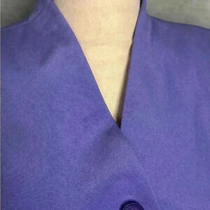 This stunning Maggy London jacket is made from 100% silk and comes in a beautiful shade of purple. It is the perfect addition to any wardrobe, providing a touch of elegance and sophistication for any occasion. With its classic style, shoulder pads and faux pockets, this jacket is ideal for travel, parties, formal events, workwear, and business settings. It is available in size 10 and is designed for regular size types. The outer shell material is of the highest quality, ensuring that the jacket is both comfortable and durable. Faux pockets finish the sophisticated look. Excellent like new condition. Smoke free home. See pictures for measurements. Ships quickly. Item #154