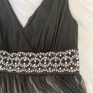 Black cocktail dress with beautiful embroidery waistline. Fit and flare party dress.