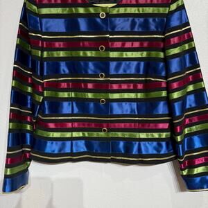 Size 14 black, pink, blue and yellow jacket by Maggy London in excellent preowned condition.