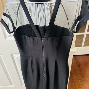 Elegant black midi dress by Maggy London. Features sheer mesh neckline and short sleeves. Perfect for evening wear.