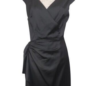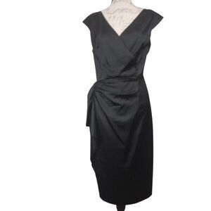 Black stretch satin sheath cocktail dress with a V-neckline & faux-wrap detailing at the waist.