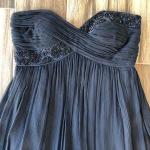 This gown is in excellent used condition (EUC); it was only worn once. Gorgeous beading detail on neckline and empire waistline. Pleating details are very flattering and dress flows beautifully.