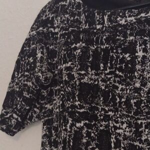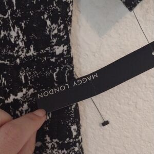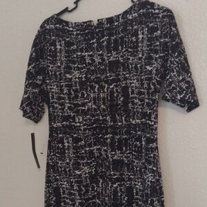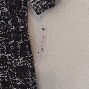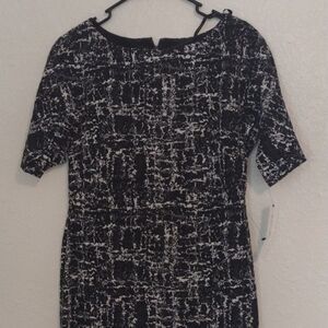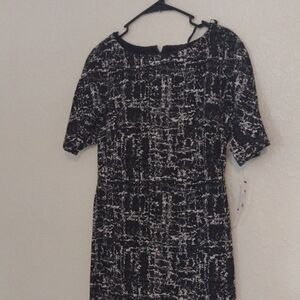 Maggy London Black Gray White Cross Hatch Sheath Dress with stretch. Great for both curvy bodies as well as lean bodies. No walking slit. Generous stretch. Offers always warmly received.