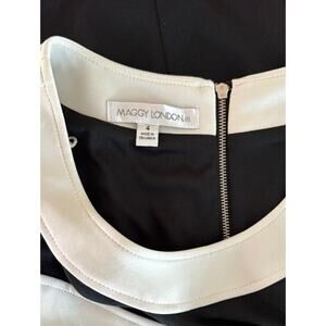 Elegant Maggy London sheath dress in a timeless black and white colorblock design.