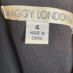 Maggy London Black/Tan/Cream Elbow Length Sleeves Shift Dress with Upper Back Lace Detail and Back Zipper Closure; Lined; Size 4; When lying flat, measures 17.5" pit to pit and 34" in length from back center neckline to bottom hem; Fabric and Care instructions shown in pictures.
