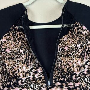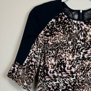 Maggy London Black/Tan/Cream Elbow Length Sleeves Shift Dress with Lace Accent
