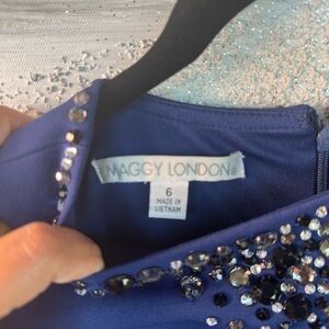 This exquisite Maggy London dress in a captivating blue hue is perfect for cocktail events or as a wedding guest. The sleeveless sheath design features a crew neck adorned with intricate embellishments, offering a sophisticated and polished look. Its midi length and structured fabric ensure a flattering fit that gracefully accentuates the body's natural silhouette.