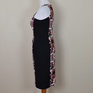 Maggy London color block sheath dress. Size 12. Lighter weight scuba material. Stretch material. Back zipper. Fully lined. Black with multi-color front and back panel. (pink, red, white, gray, brown, black, purple). Sleeveless.