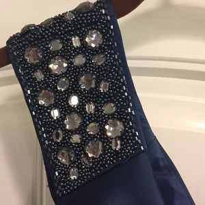 Gorgeous deep blue Maggy London evening dress in size 4 with jewel embellished shoulder straps. Front knot twist with hidden zip closure at back. Never worn before and in excellent condition. Originally purchased at Nordstrom.