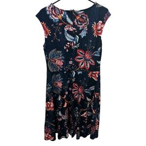 Elegant navy dress with a vibrant floral pattern. Perfect for any occasion. Hidden back zipper closure. Stretchy jersey material. Capped sleeves. Keyhole to front.