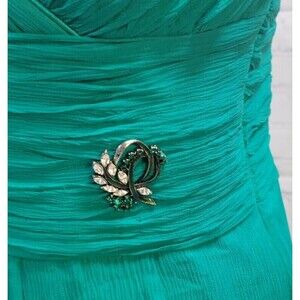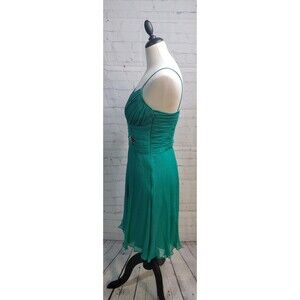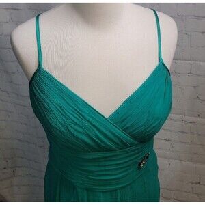 Maggy London Jade Green 100% Silk Ruched Dress size 10 V Neck Spaghetti Strap