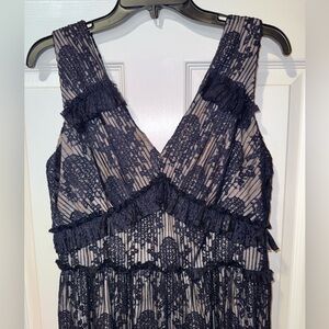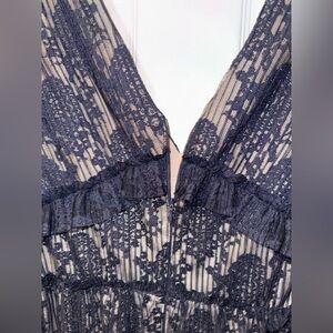 Chic navy lace maxi dress. Features intricate lace overlay. Perfect for elegant occasions. it’s basically brand new, needs a new home! make me an offer :)