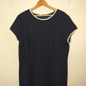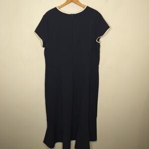 Maggy London navy + ivory trim short sleeve hi low hem midi dress. Size 18. Zips up the back. Polyester spandex. (23151)
