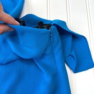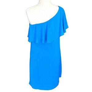 Maggy London One Shoulder Flounce Dress Size 10 Sea Blue Crepe Ruffle Shift