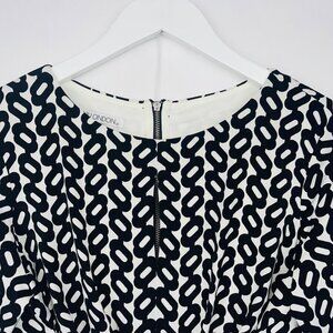 This Maggy London midi dress features a bold black and white geometric print with a flattering waist tie detail. Designed for an elegant and polished look, it is suitable for professional settings or special events.