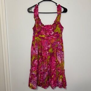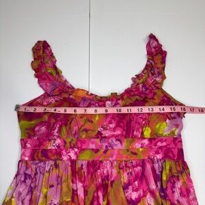 Gorgeous and vibrant Maggy London Petites sleeveless sundress in a stunning pink, orange, and green abstract floral print. Features a flattering empire waist, ruffle trim neckline and straps, and tiered hem for a feminine, flowy silhouette. Perfect for spring, summer, weddings, brunch, or vacation.