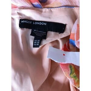 Maggie London highlights the beauty and romance of spring. This maxi dress is tailored from a vibrant floral pattern with a ruffle apron-style bodice. Style it with everything from a pair of trending ballet flats to a pair of sandals.