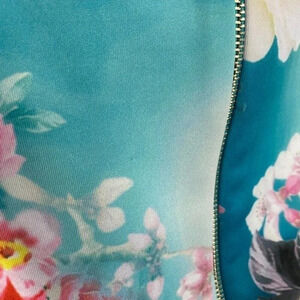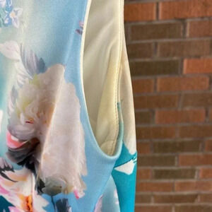 Very minor snag in fabric on back of dress near zipper. Slight deodorant discoloration on white inner lining in armpit area.