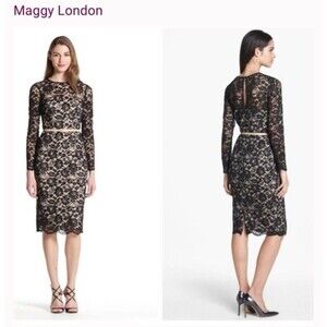 Maggy London Sheath Dress Size 10 Nude Black Lace Overlay Star Flower NWT