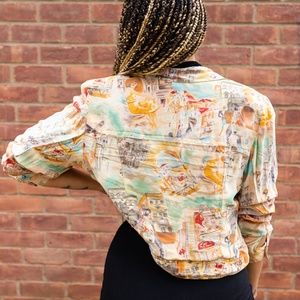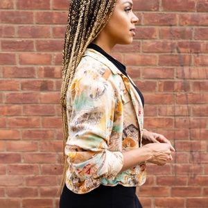 Creme and multicolor Maggy London silk jacket with pointed collar, abstract prints throughout and button closure.