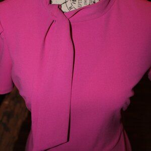 Maggy London deep pink color. Bow tie neck sheath dress. Puff sleeves. Hidden back zip closure with kick pleat in the back, top bodice of dress is lined. 94% polyester, 6% spandex Lining: 100% polyester. 40 inches from shoulder to hem. Machine wash cold. Dress has only been dry cleaned.