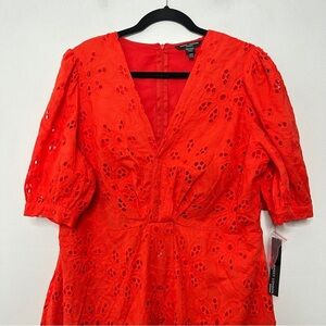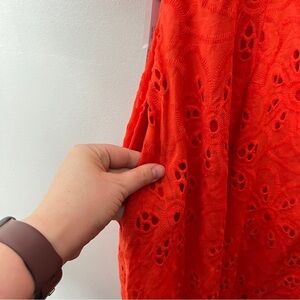 Elegant tomato red midi dress. Features intricate eyelet design. Short sleeves and V-neckline. Perfect for any occasion.