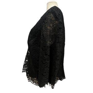This Vintage Maggy London career blouse in size 22W is new with tags. It features a V-neck and back, long sleeves, and elegant black lace detailing for a sophisticated and stylish look.