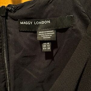 Maggy London v-neck flutter sleeve faux wrap dress in black. Surplice neckline. Short sleeves. Back zipper closure. Women's size 8. Gently used with no flaws.