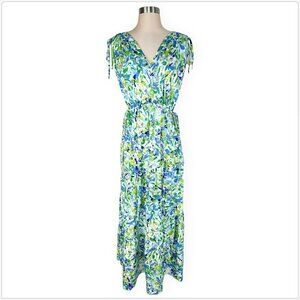 Maggy London White Aqua Floral Print Maxi Shoulder Gather Dress NEW NWT 18