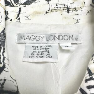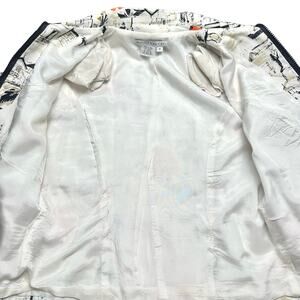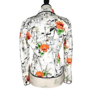 Pre-owned women’s Maggy London old town village sketch art and floral print lightweight zip jacket featuring full lining and shoulder pads.