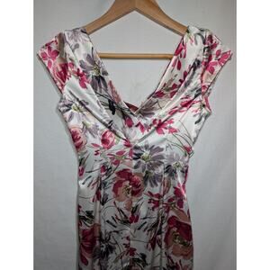 Maggy London Women's Floral Sheath Dress V Neck Side Ruched Sz 2 Feminine. Dress is in good condition. There is a minor material pull on the back of the shoulder, see up close photo.
