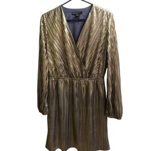Maggy London Womens Metallic Gold Pleated Long Sleeve V Neck Dress Sz 12 Holiday