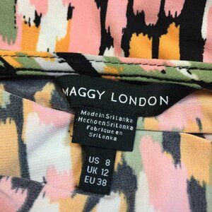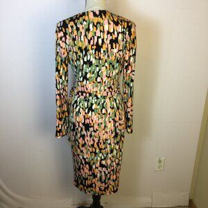 Maggy London Wrap Dress Size 8 Womans Black Pink Print Long Sleeve Stretch Knit