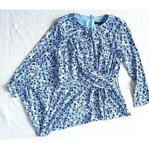 This Maggy London wrap front long sleeve blue floral dress is in mint condition! This beautiful dress also features an elastic waist, an 18” hidden zipper in back in a matching blue and lining at the top. Really nice draping in front.