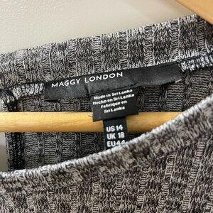 Maggy London, long sleeve’ tiered dress, size 14, Heather gray. NWT. 98% polyester, 2 % spandex., machine wash cold water. New with tags from Nordstrom’s. Very nice dress. Measurements are: chest 22 inches, length 37 1/2 inches, sleeves 23 inches