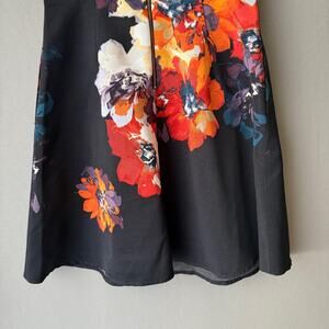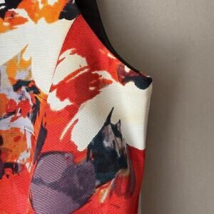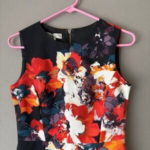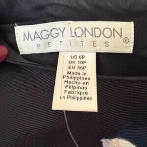 Pre-owned Maggy London Petites dress, size US 6P, UK 10P, EU 36P. The sleeveless A-line dress features a black background with a vibrant floral print in shades of red, orange, white, and dark purple. The dress is made of 100% polyester shell and 100% acetate lining. It has a concealed back zipper. Measurements are not provided. Dry clean only. Made in the Philippines.