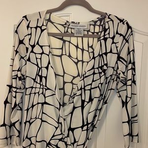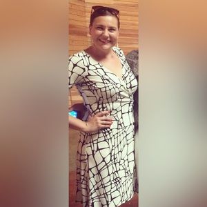 This dress is a beautiful addition to any wardrobe for a woman on the go! The pattern is flirty and fun and the fabric makes this a great transitional dress for any season. It does run a bit more petite but is a true wrap dress style with room for a variety of shapes in the size 12 range. Hits at the knee and the elbow for mid length.
