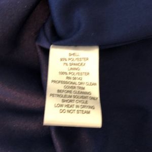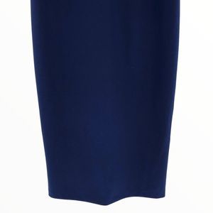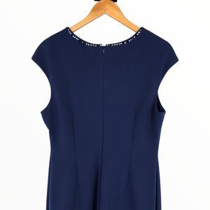 Beautiful darker blue dress, not quite navy, with a black and great crystal-embellished neckline, soft cap sleeves, sheath silhouette, hidden back zip with hook and eye closure, lined.
