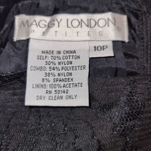 Maggy London Petites Mini Dress Size 10P color black with lace rose detail and 3/4 ruffled sleeves, fully lined, self 70% cotton 30% nylon combo 54% polyester 38% nylon 8% spandex lining 100% acetate hidden back zipper pit to pit 19" length 33" excellent preowned condition (New1817)😊