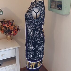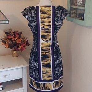 Drama defines this dress. A border print is centered down the front and back. Princess seams and a bright finish at the bottom. Boat neck, cap sleeves. Top lined. Side zip. Size 8 measures 38 at chest. 31 at waist, 38 at hips. 37 long from shoulder to hem. So different and pretty.