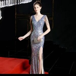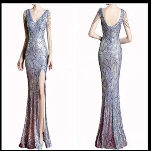 Magic Blue Sequined, Abstract Pattern, Sleeveless, Backless, V Neck, Gown