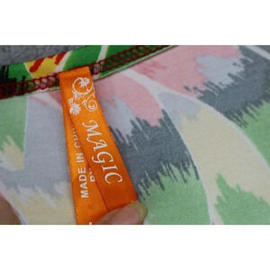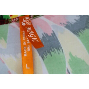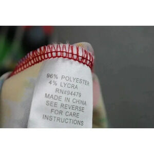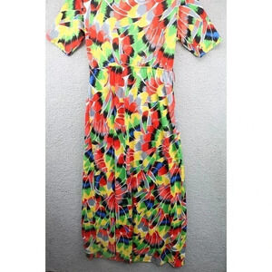 This is a dress by Magic that is very bold in color. It is a size Large. It is a maxi and is silky and flowy. It is 96% Polyester and 4% Lycra. Laying flat, it measures: Armpit to armpit-20" and the length is 56". It has a couple of threaded belt loops, so I am assuming that it originally had a belt. You could clip them off or use another belt. Very pretty dress and in good conditioin.